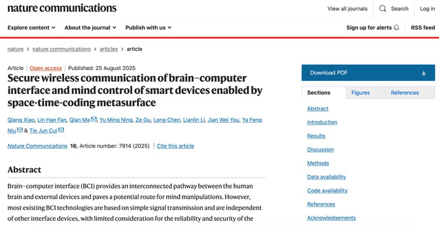 近日,公司设计科学系牛亚峰教授团队与太阳集团tyc33455官网毫米波全国重点实验室崔铁军院士团队、北京大学李廉林教授团队合作,提出了一种深度融合脑机接口视觉刺激编码与超表面时空编码的策略,实现了人脑和外部设备之间可靠安全的信息传输与大脑控制,所提出的无线脑机接口方案可以为人机交互和智能超表面建立一个安全的脑机工作范式。相关研究工作以题为“Secure wireless communication of brain–computer interface and mind control of smart devices enabled by space-time-coding metasurface”的论文,于2025年8月25日发表在国际知名期刊《Nature Communications》上。牛亚峰教授为论文共同通讯作者,设计学博士生范林涵为共同第一作者。