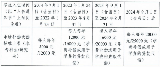 根据《财政部、教育部、中国人民银行、金融监管总局关于调整完善国家助学贷款有关政策的通知》(财教〔2024〕188号)规定,自2024年秋季学期起,服兵役资助学费补偿、用于学费的国家助学贷款和学费减免标准调整为本专科员工每人每年最高不超过20000元、研究生每人每年最高不超过25000元。近年不同时间入伍的员工,适用的学费补偿或贷款代偿申请标准如下: