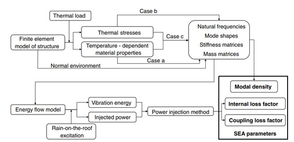 An algorithm is presented to predict the statistical energy analysis (SEA) parameters of structures in a thermal environment. An energy flow model considering thermal effects is established by the finite element method, and the SEA parameters of the structure under a thermal environment are obtained by a power injection method. The proposed algorithm is applied to a simply supported L-shaped folded plate under rain-on-the-roof excitation. The accuracy of proposed method is verified by the travelling wave approach, and the influence of thermal effects on the SEA parameters is further investigated. The results show that, when only the effect of temperature-dependent material properties is considered, both the coupling loss factor (CLF) and the modal density have an opposite trend with the changing of the elastic modulus and shear modulus; when only the effect of additional stiffness due to thermal stresses is considered, the internal loss factor (ILF) and CLF decrease with the increase of temperature; when both the effects of the temperature-dependent material properties and the additional stiffness due to thermal stresses are taken into account, the ILF and CLF decrease with the increase of temperature. Furthermore, when the structure is exposed to a nonuniform thermal environment, the modal density, ILF, and CLF will decrease with the increase of the temperature gradient.