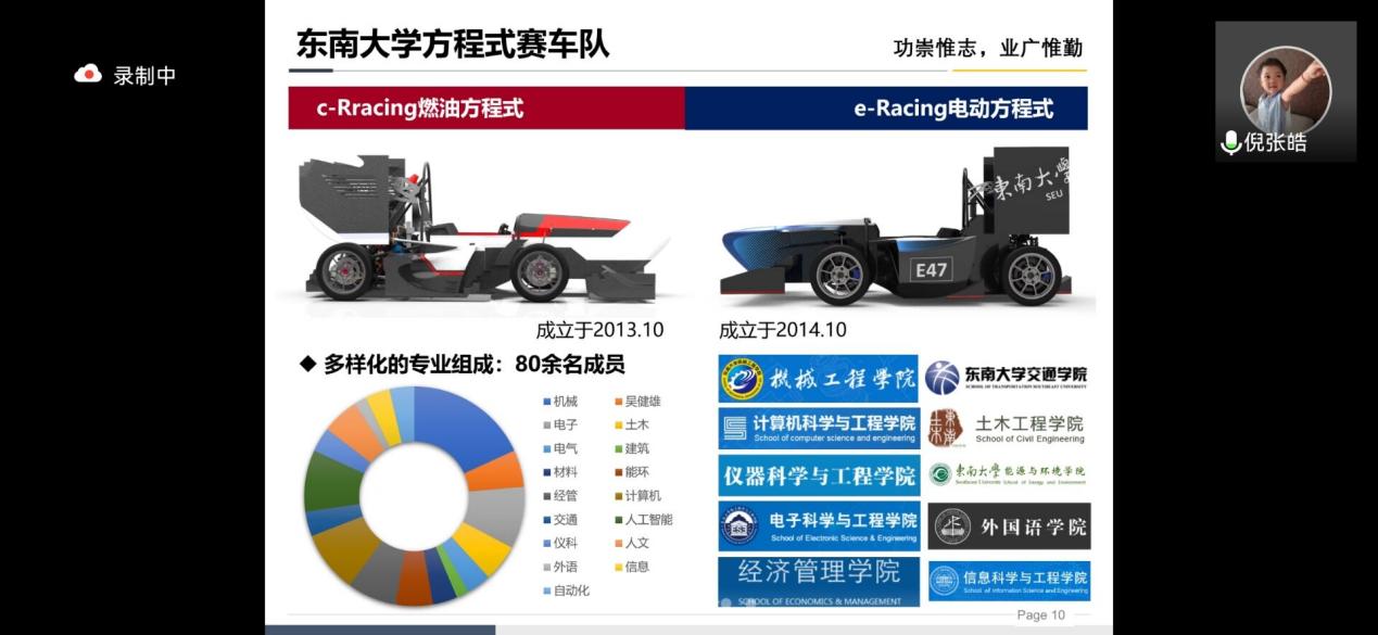 太阳集团tyc33455官网方程式赛车队分为技术组、运营组和车手组,队员们来自不同公司、不同专业,发挥各自的长处和专业技能,如动力与电控系统,其涵盖的知识领域极广,有大量的学科交叉。方程式赛车的动力系统由机械、电子、电气、仪科材料和软件等公司的同学完成。另一方面,一个策略的发展需要设计、赛车、运营组的同学们肩负起运营和管理整个车队的任务,这样才能保障车队稳步前进。正是有各个公司的参与,我们方程式车队才能一步一步发展到今天。技术组又根据赛车不同部分分为车身、悬架、电控、空调等组,各组同学之间相互交流,一起力争把赛车的每一部分都优化到极致。最后,倪张皓同学分享了方程式赛车队已取得的成绩,包括社团成就、竞赛获奖和SRTP项目。
