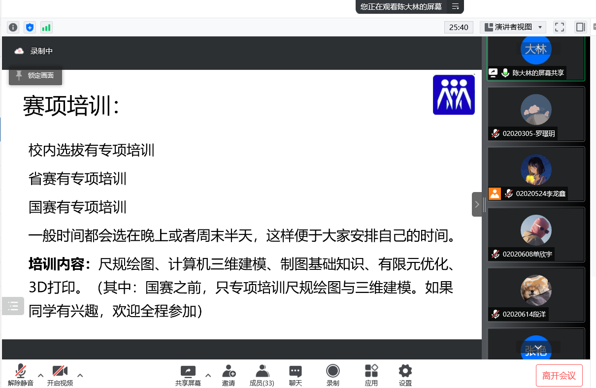 首先,陈大林老师向同学们介绍了全国赛机械类的相关项目,其主要包括尺规绘图、三维计算机建模、图学基础知识和产品设计与3D打印四个项目。陈老师对每个比赛项目都进行了详细的介绍和分析。