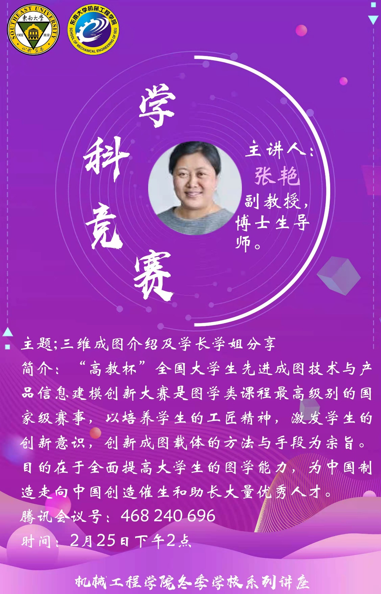 2月25日下午,学科竞赛讲座开讲,张燕老师、陈大林老师和周鹤翔同学对有关“高教杯”全国老员工先进成图技术与产品信息建模创新大赛进行了介绍。